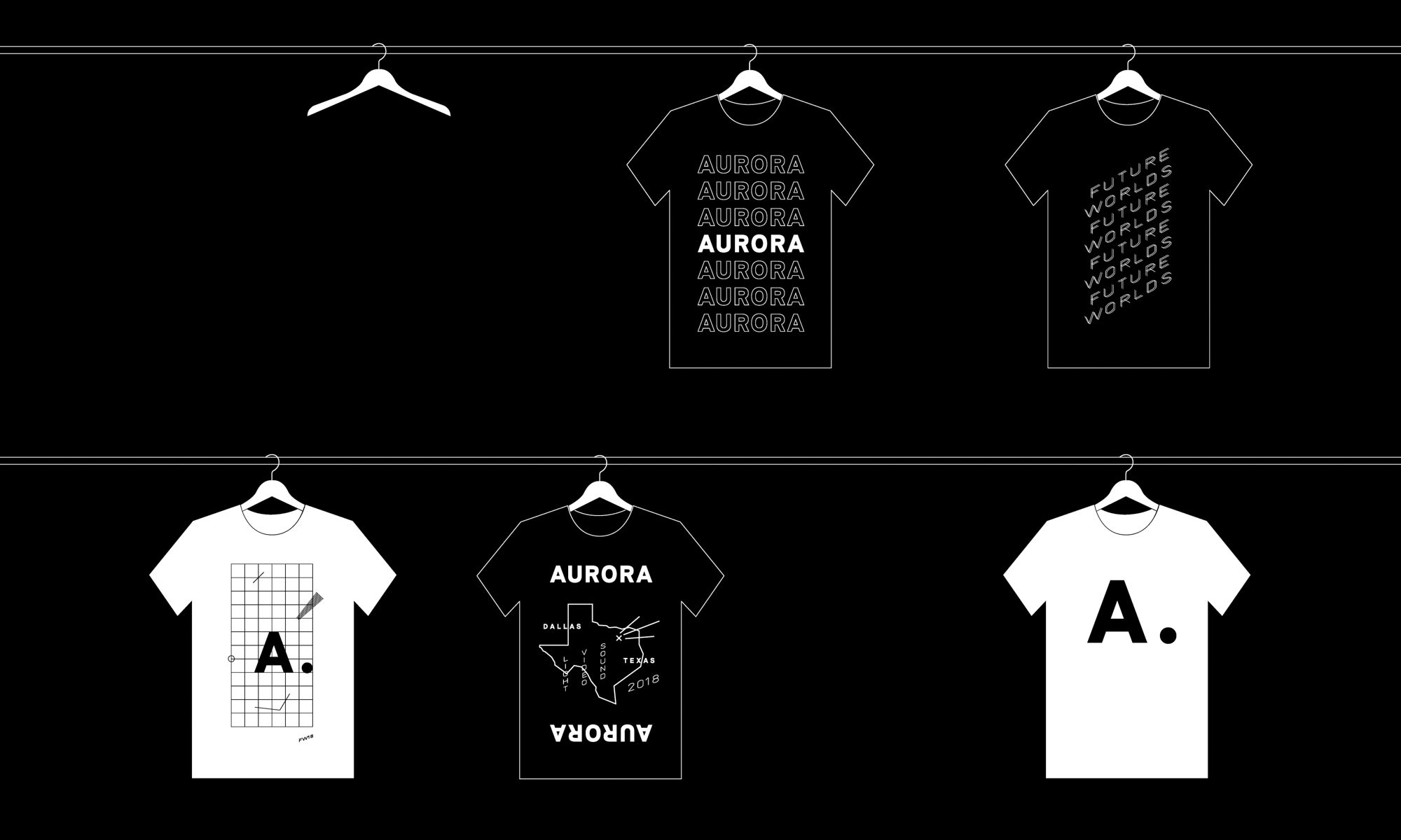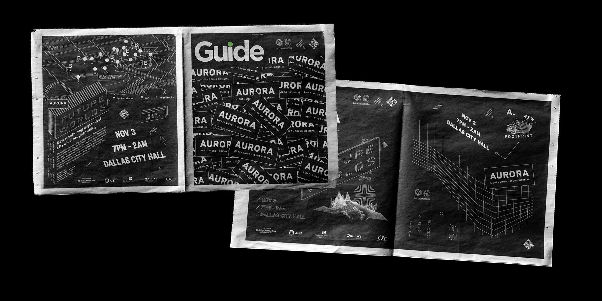 We developed a new master AURORA brand and a “Future Worlds” specific brand for the 2018 exhibition. The stark black and white brand identity serves as a canvas for the vibrant color of the artwork itself and represents the after-dark setting of the event.